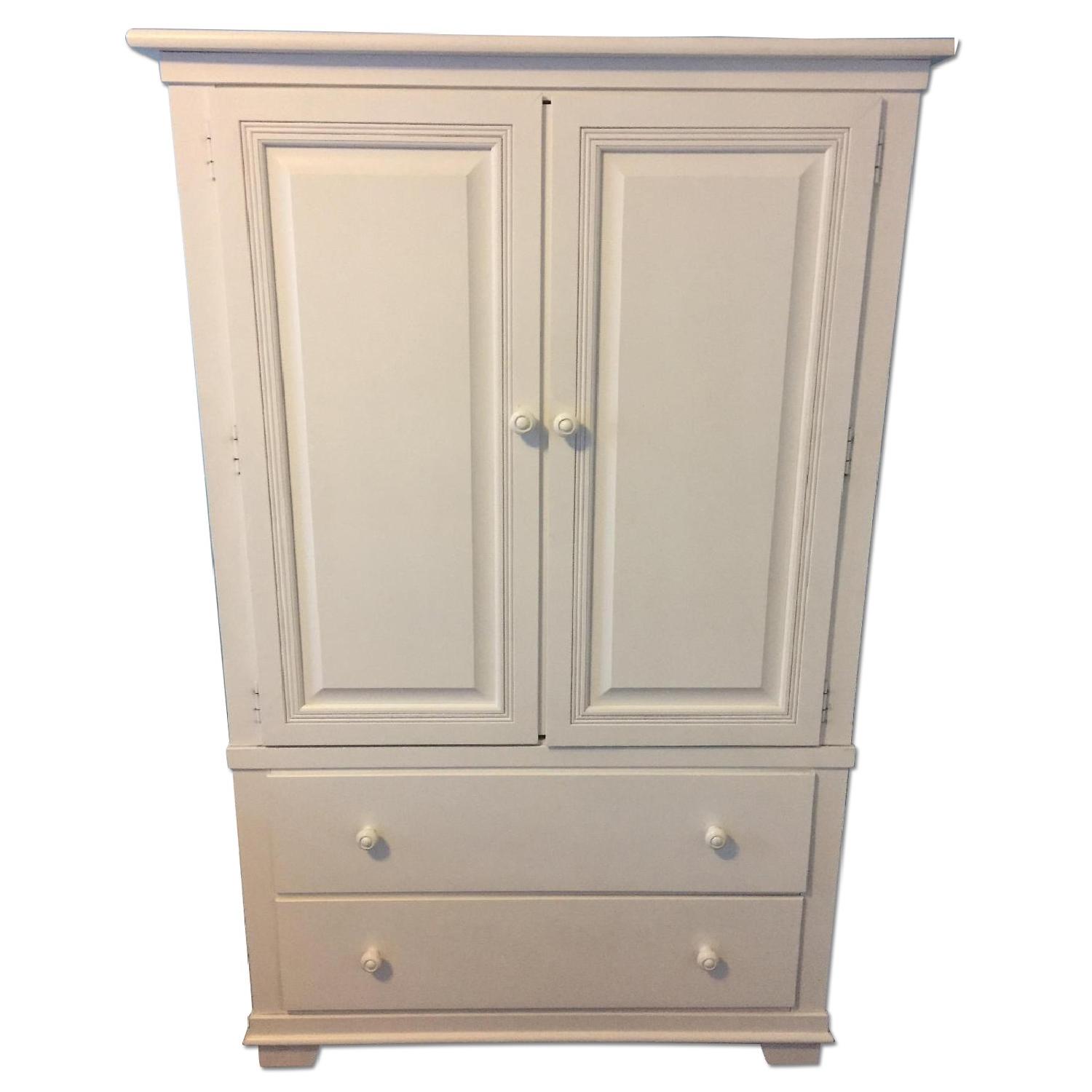 Background. Sublime et authentique armoire 2 portes evidence réalisée par bébé provence. De couleur blanche hêtre, elle est composée d'un espace penderie, de 4 étagères et d'un tiroir coulissant.