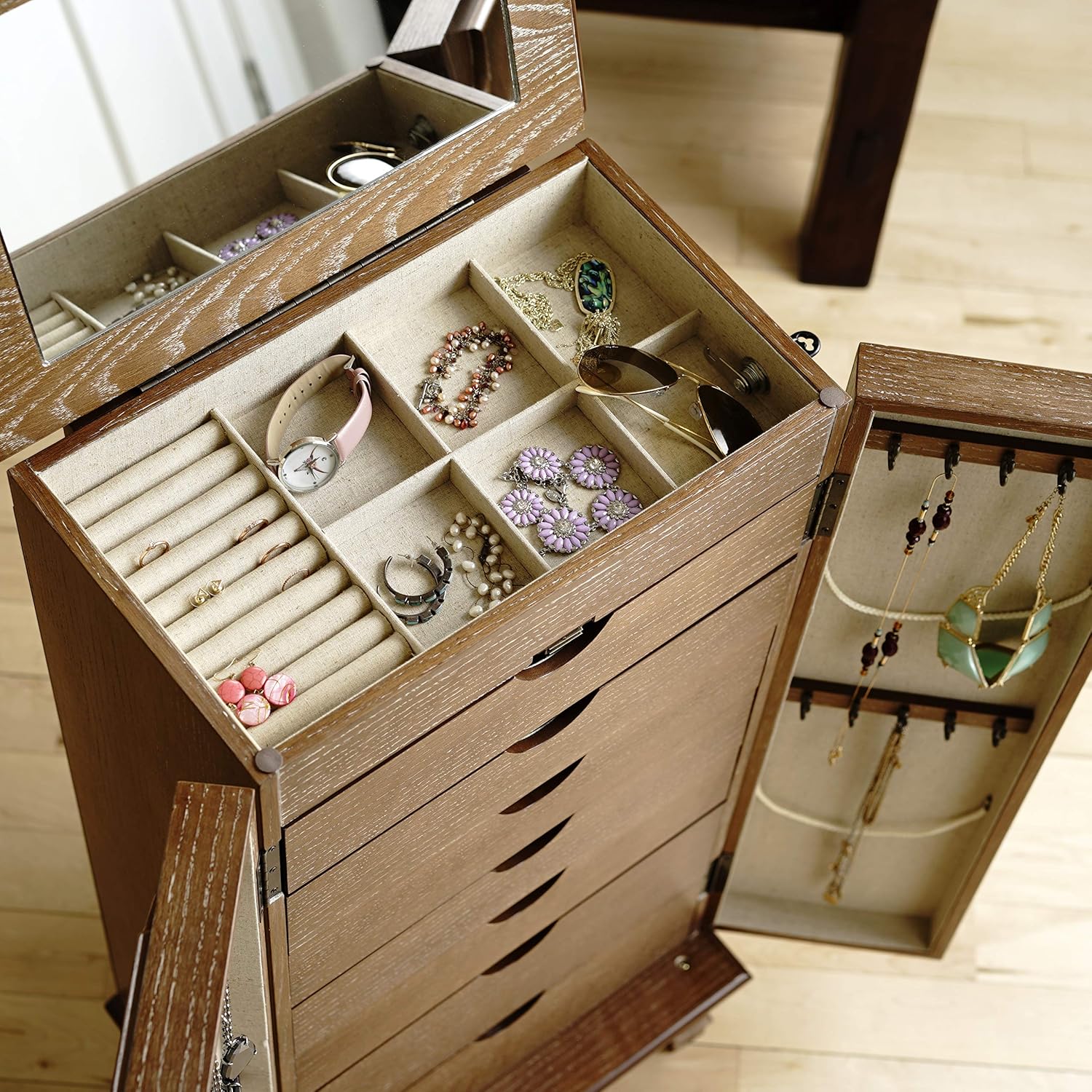 Each handle of jewelry armoire is perfectly placed for easy gripping and drawers retract for quick views you can have.